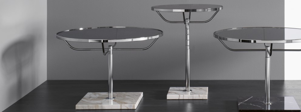 A classic round table in chrome, with a larger top diameter than its smaller counterpart. Featuring manual height adjustment and a marble base.