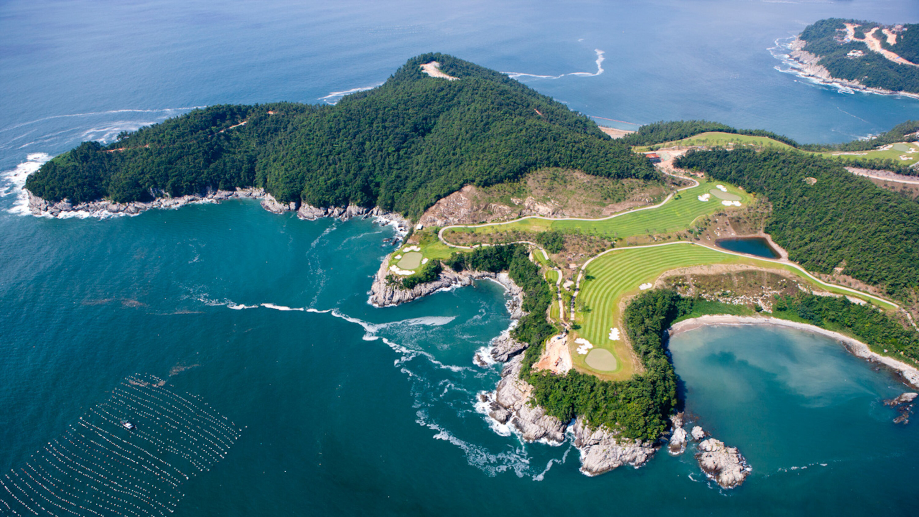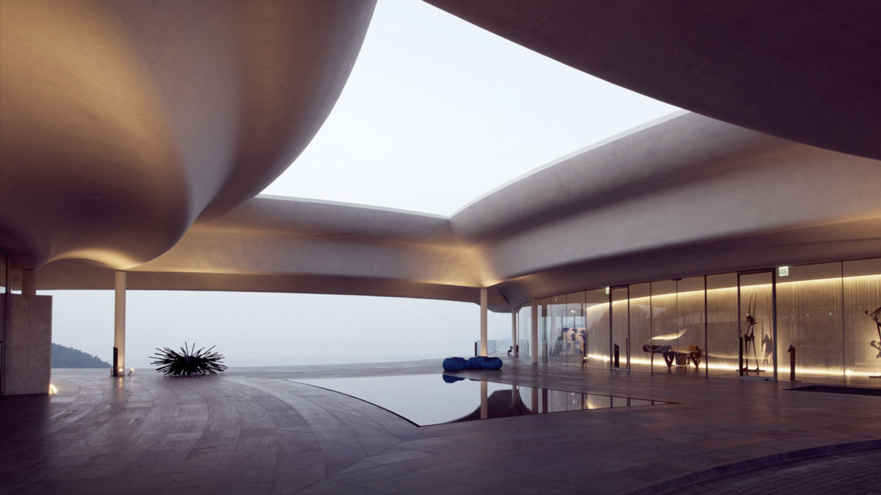 South Cape Spa and Suites is a resort complex facing the South Sea on the Korean Peninsula, where you can also enjoy playing golf. This luxury resort, which is open to the sea, offers guests the ultimate in relaxation. The concrete walls undulate like waves along the building, creating a dynamic appearance that makes it seem to float in the sky. Guest rooms are furnished with DUX beds and Ligne Roset furnishings, and you can enjoy a Geneva sound system. In addition, the rooms feature Aesop amenities. Don't miss the rare pianos and artwork scattered throughout the building.
